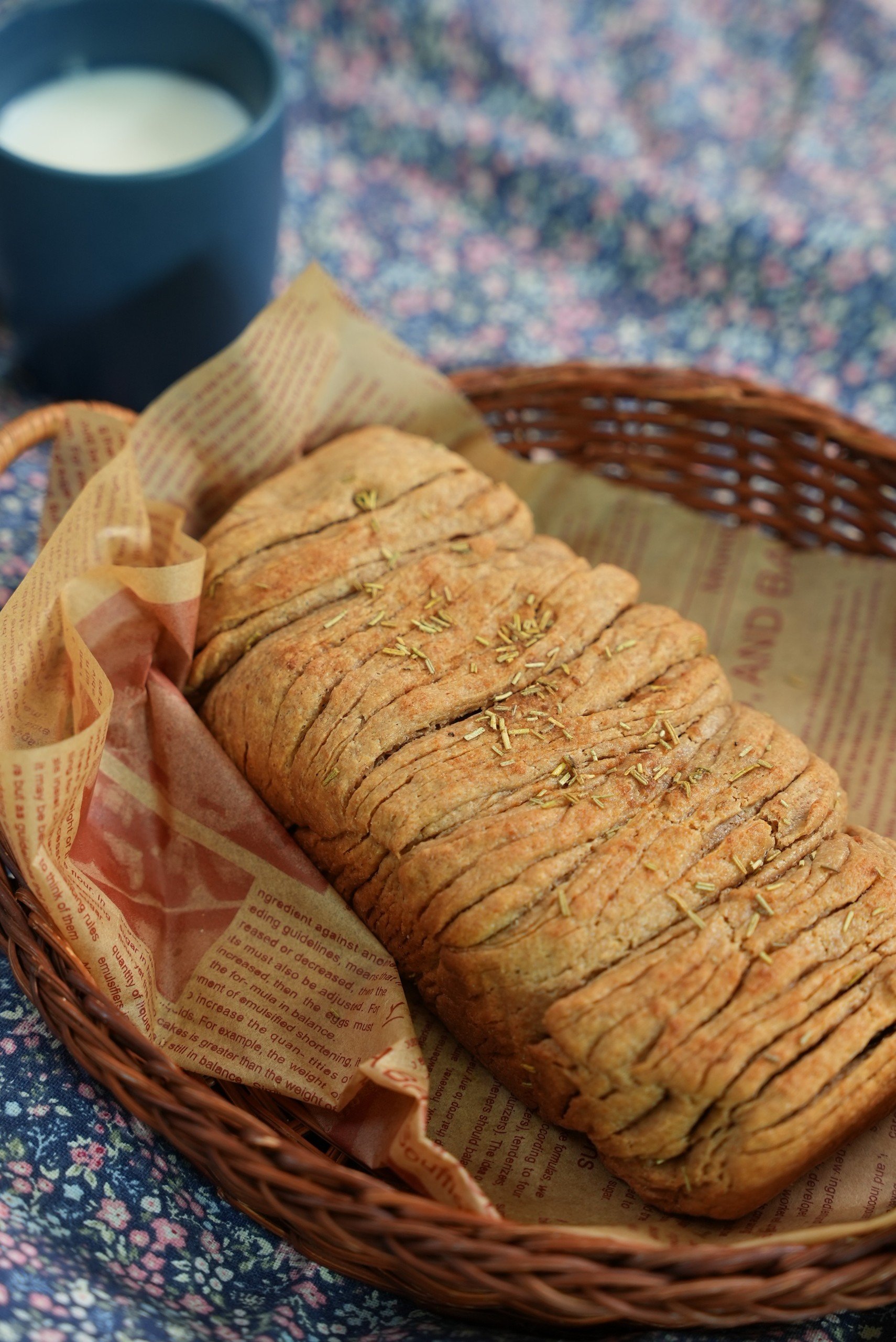 Cách làm: Hòa tan men với nước ấm, để khoảng 5-10’cho men kích hoạt. Chuẩn bị 1 âu lớn, trộn bột mì và muối, có thể rây cho mịn. Thêm nước, dầu, mật hoa dừa trộn đều. Thêm men và nhào bột bằng tay hoặc máy cho đến khi khối bột không dính tay. Bọc âu bằng màng bọc thực phẩm hoặc phủ khăn ẩm, ủ trong 1h. Sau 1h, nhồi lại bột và chia làm 8-10 phần bột bằng nhau. Vê tròn, cát dẹt. Trải từng lớp bột và phết hỗn hợp, chồng thêm từng lớp và lặp lại. Cắt đôi khối bột thành 2 phần bán nguyệt, xếp vào khuôn. Nướng 40-45 phút. Có thể phết thêm hỗn hợp ra bên ngoài.  |