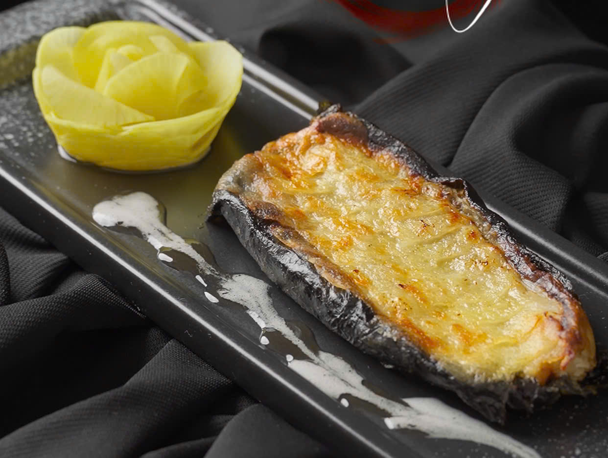 Cách làm Cà tím gọt vỏ, rắc gia vị. Bọc bằng tấm rong biển, phết dầu và bỏ lò 190 độ 15’ Khoai tây bào lát mỏng, lấy khuôn cắt thành các hình tròn nhỏ. Ngâm nước muối rồi vớt ra để ráo Pha hỗn hợp bột chiên giòn, nhúng khoai tây vào. Cà tím lấy ra rạch một đường để trải cà tím ra. Xếp các lát khoai tây lên. Áp chảo hoặc bỏ lò cho vàng mặt. |
