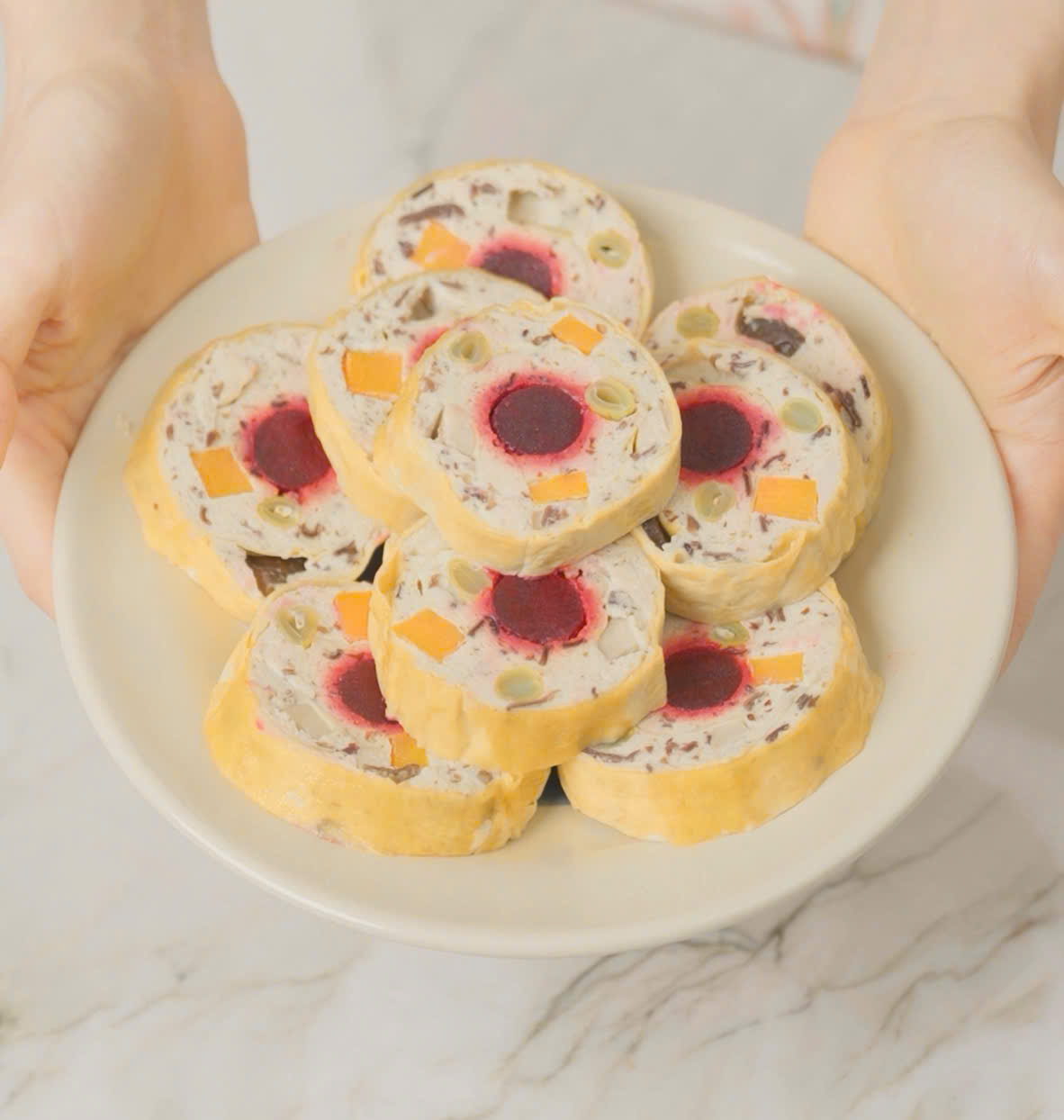Xay hoặc thái nhỏ mộc nhĩ, nấm hương, để riêng. Củ dền đem hấp chín, dùng khuôn cắt thành các miếng hình trụ dài đường kính 1cm. Cho đậu phụ vào túi lọc để bóp chắt bớt nước. Xay mịn khoai môn, đậu phụ và bột năng. Trộn cùng nấm hương, mộc nhĩ, hành khô, hành lá và gia vị. Trải miếng váng đậu ra, rắc đều bột năng lên bề mặt. Dàn đều hỗn hợp vừa trộn lên miếng váng đậu. Xếp củ dền và lần lượt cà rốt, đậu que, nấm đùi gà. Cuốn chặt tay đến hết, bọc bằng giấy bạc. Hấp 20 phút, để bớt nóng rồi cho vào ngăn mát cho nguội hẳn (20-30’) rồi lấy ra thái lát. |