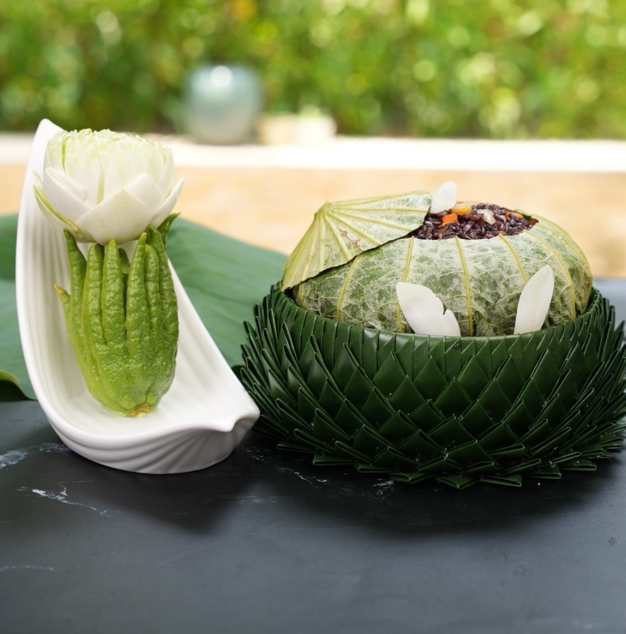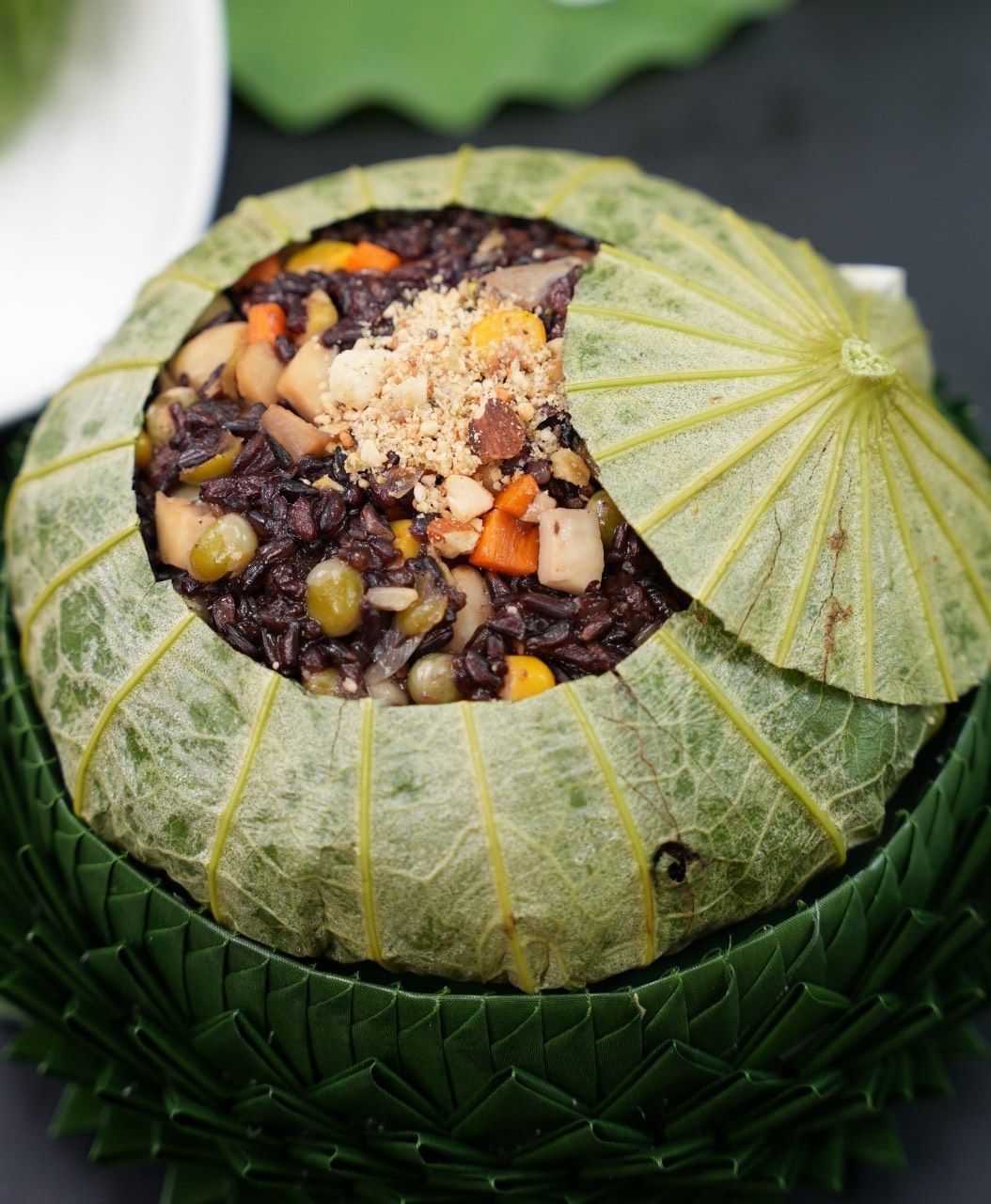 Cơm lứt hạt sen cùng đậu hà lan, nấm, rau củ được gói trong lá sen thơm nức ăn cùng muối mè dinh dưỡng ❤️