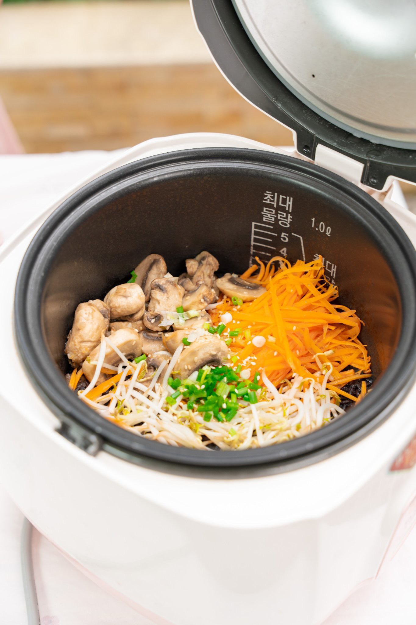 1 cup gạo lứt đen, ngâm qua đêm, rửa sạch (Các bạn có thể mua tại đây) ½ cup đậu lăng đỏ, ngâm qua đêm, rửa sạch (Các bạn có thể mua tại đây) 200gr nấm mỡ 1 củ hành khô, băm nhỏ 100gr giá, rửa sạch 100gr cà rốt, bào sợi 1 nhánh hành lá, thái nhỏ 2 thìa canh mè trắng rang (+1 thìa để trang trí) (Các bạn có thể mua tại đây) 2 thìa canh dầu mè thơm (Các bạn có thể mua tại đây) 1 thìa canh hạt nêm (Các bạn có thể mua tại đây) 1 thìa canh tamari (Các bạn có thể mua tại đây) |