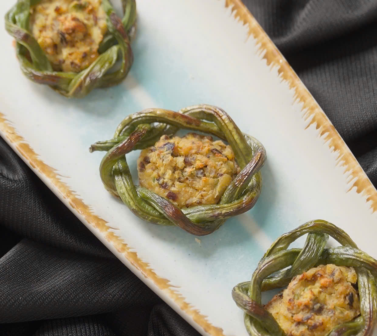 Cách làm: Đậu gà ngâm qua đêm rồi luộc chín Đậu đũa rửa sạch, chần 2-3’ rồi trụng nước đá, vớt ra để riêng Vặn thành hình hoa Xay tất cả nguyên liệu nhân, cho vào túi bắt kem Cho đậu lên chảo, bóp phần nhân vào giữa Rán chín hoặc bỏ lò 190 độ 15-20’ |