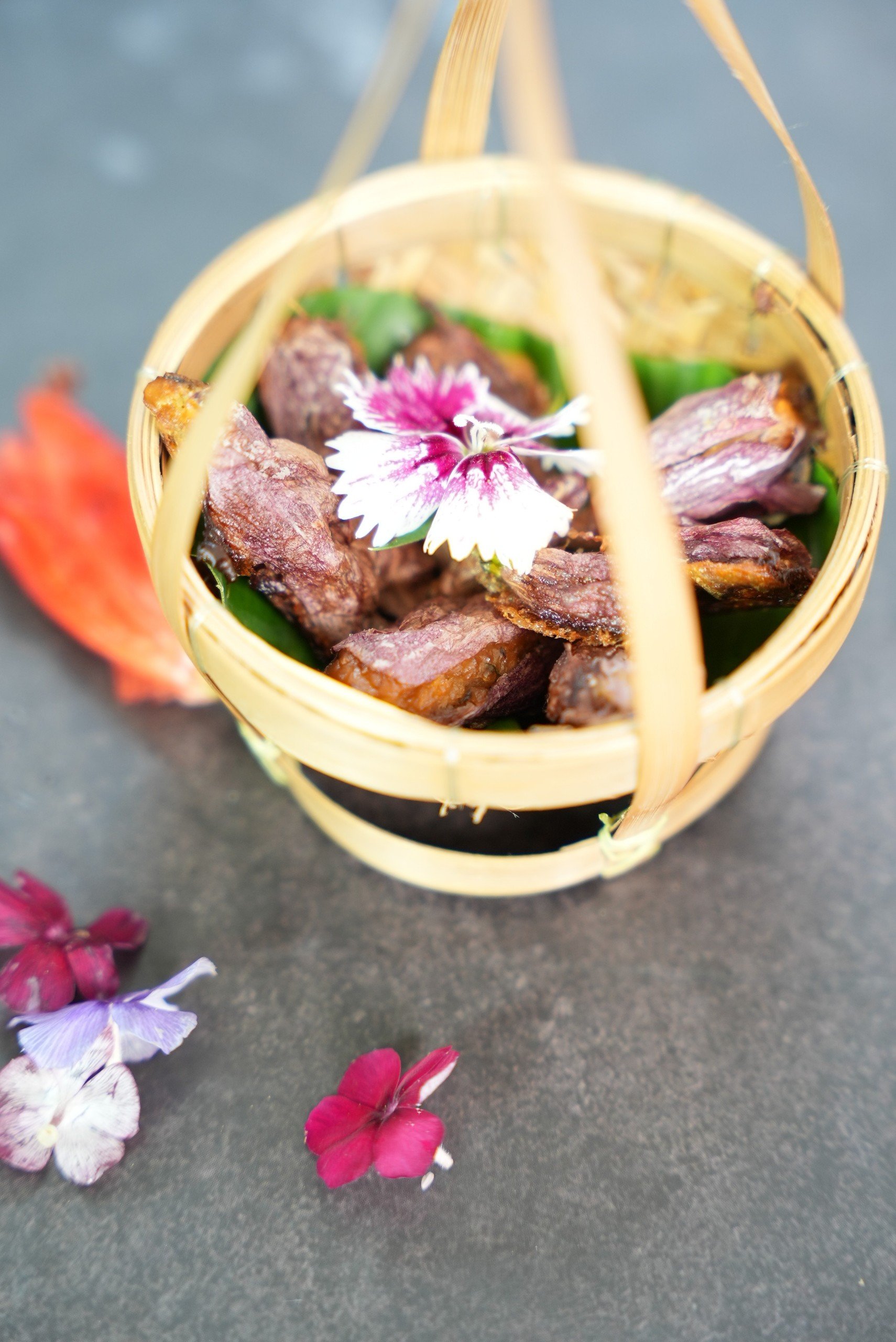 Cách làm: Bật lò nướng 170 độ. Xay tất cả các nguyên liệu nhân cho nhuyễn mịn, cho vào túi bắt kem. Bóp phần nhân vào bên trong hoa. Nhúng hoa qua bột chiên giòn. Xếp lên khay nướng lót giấy nến. Xịt hoăc phết dầu ăn. Nướng 170 độ 20-25 phút cho giòn. |