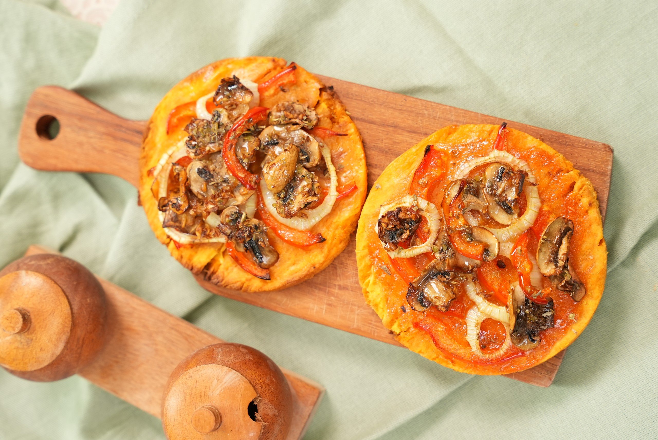 50gr nấm mỡ 50gr ớt chuông 50gr hành tây 2 thìa canh xốt pizza (cốt cà chua) 1 thìa cà phê oregano khô Phô mai chay