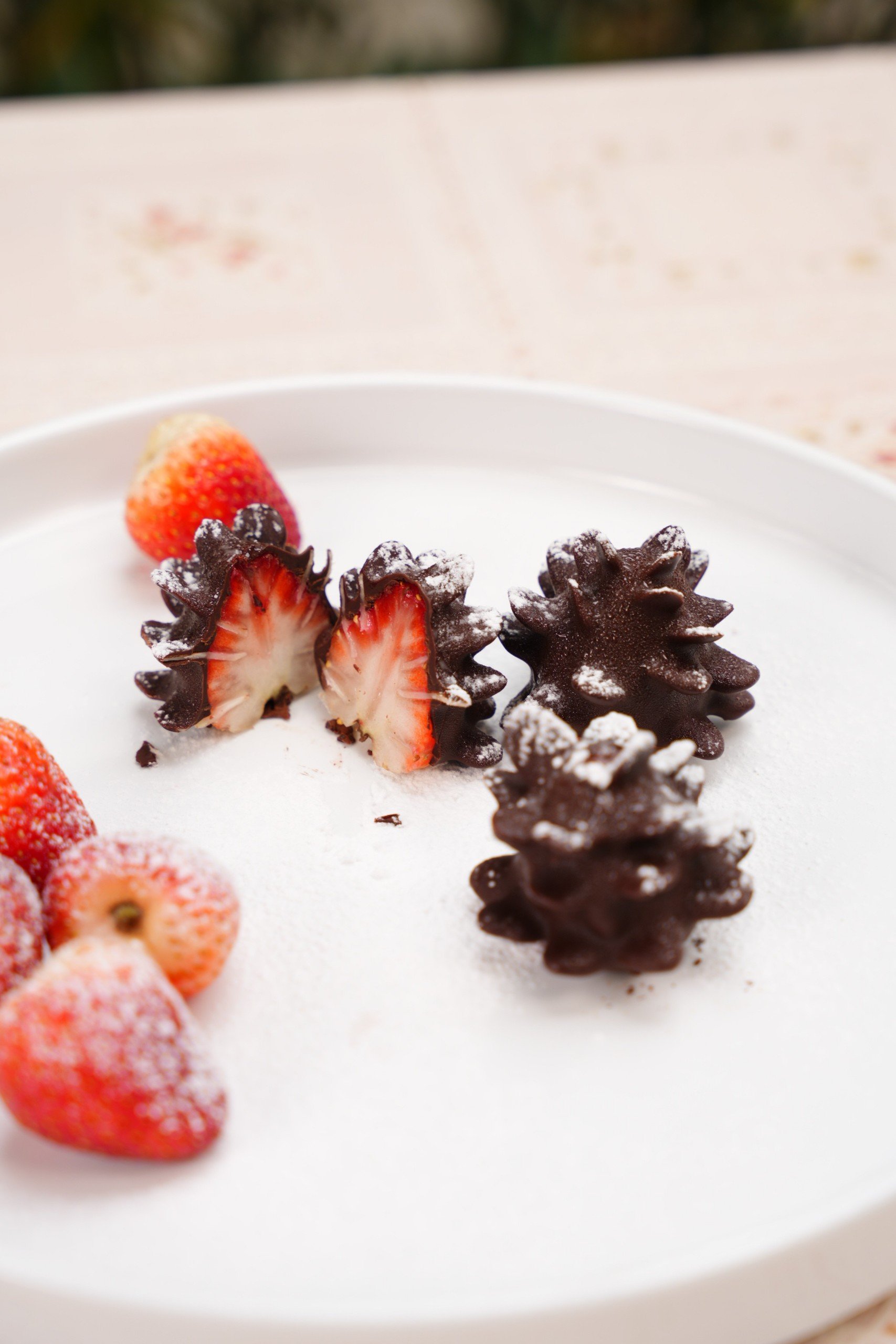 | Cách làm: Dâu tây rửa sạch, để ráo. Dùng dao rạch các đường nhỏ quanh trái dâu. Cắm phần đầu nhọn của hạnh nhân lát vào trái dâu. Cho socola đen vào bát, quay trong lò vi sóng hoặc hấp cách thủy cho lỏng. Dùng que cắm vào trái dâu, nhúng vào socola. Để ngăn mát cho đông lại. Trang trí bằng đường bột. |