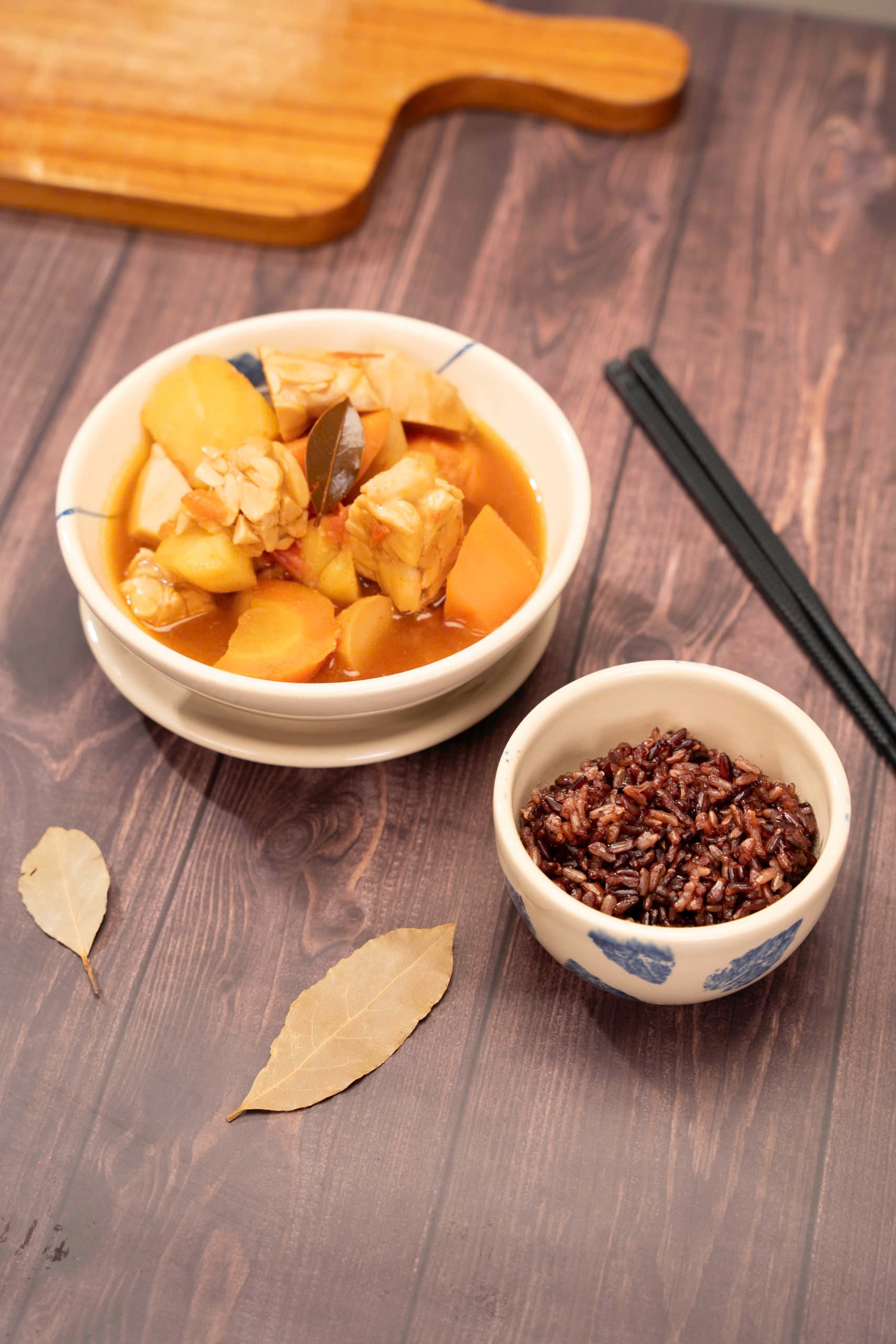 200gr tempeh, cắt miếng (Học làm tempeh tại đây) 1 củ khoai tây 1 củ cà rốt 1 củ hành tây 2 cây nấm đùi gà 3 quả cà chua 2 thìa canh tương cà 2 cup nước/nước dừa 2 lá nguyệt quế 2 thìa canh tamari (Các bạn có thể mua tại đây) 2 thìa cà phê hạt nêm (Các bạn có thể mua tại đây) 2 thìa cà phê đường phèn ¼ thìa cà phê hạt tiêu |
