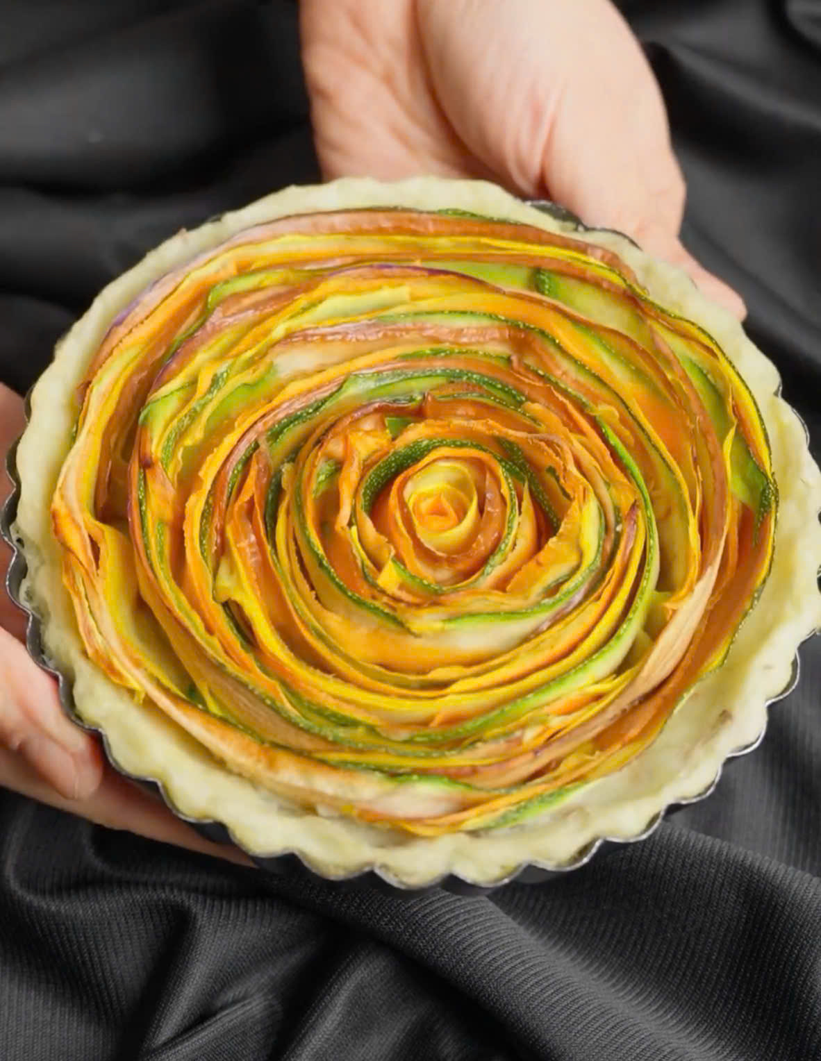 Làm nóng lò 190 độ. Khoai tây hấp chín, dùng dĩa nghiền nhuyễn. Phết dầu lên khuôn, cho khoai tây lên khuôn, nhấn đều lên khuôn. Rau củ bào thành dải, ngâm nước muối, để ráo. Xếp lên khuôn từ ngoài vào trung tâm thành hình bông hoa. Rưới dầu oliu và rắc gia vị. Nướng 190 độ 20’ |