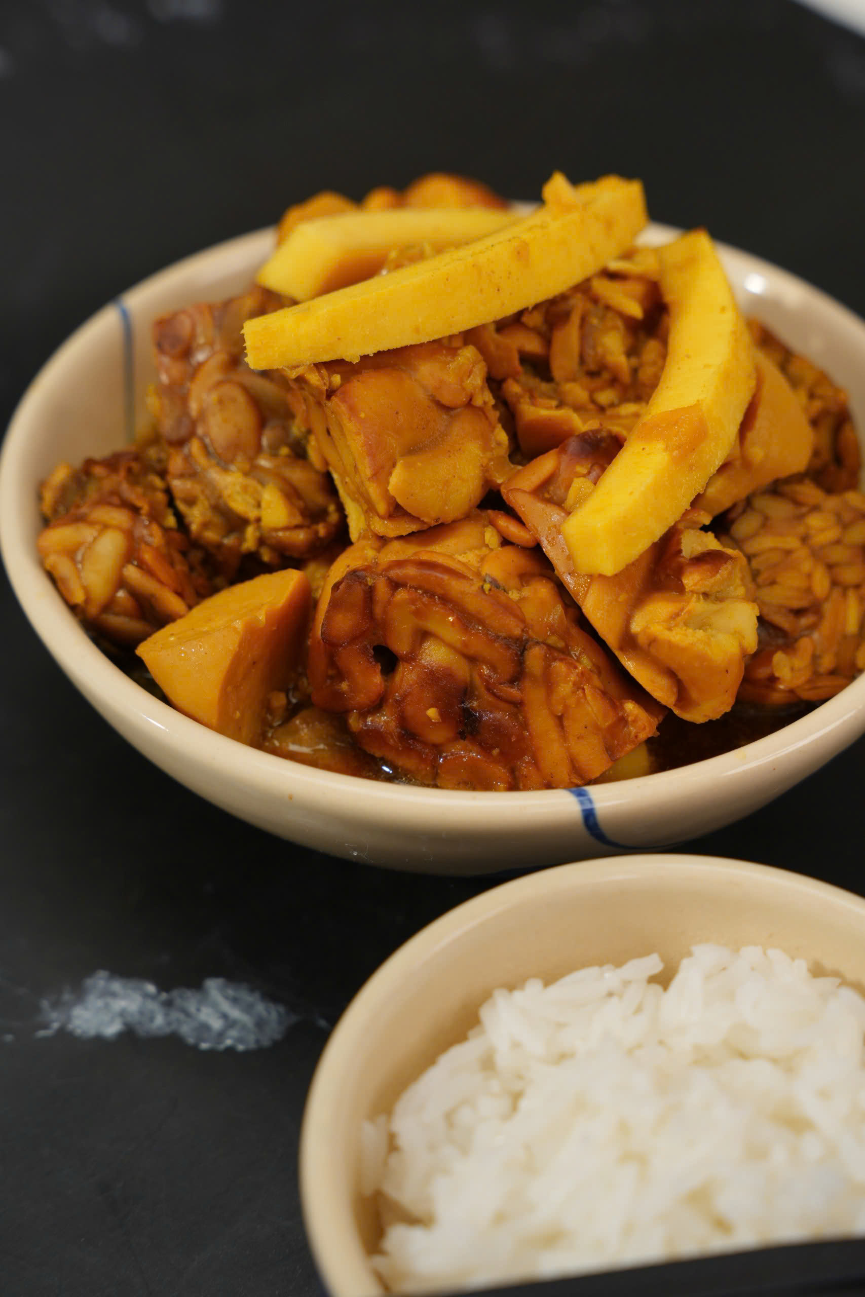 200gr tempeh, cắt miếng (Học làm tempeh tại đây) 1 miếng dừa già, thái thanh 500ml nước dừa 2 củ hành khô, băm nhỏ 2 thìa canh tamari (Các bạn có thể mua tại đây) 2 thìa cà phê hạt nêm (Các bạn có thể mua tại đây) 2 thìa cà phê đường phèn Hạt tiêu |