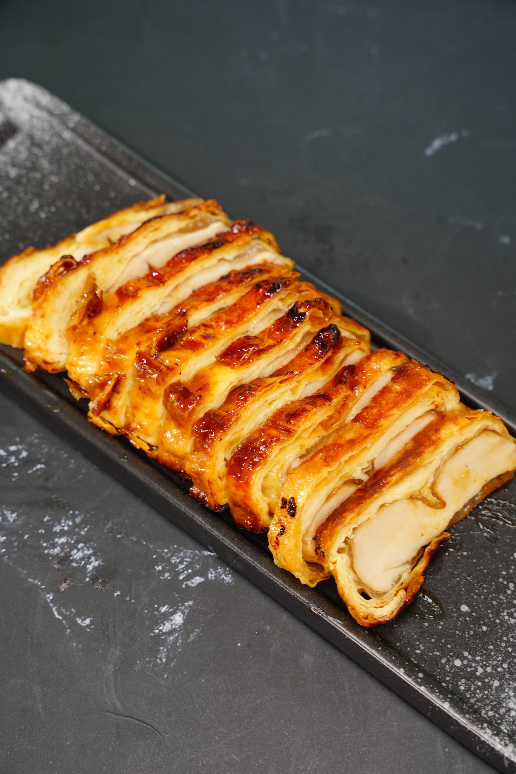 Trộn hỗn hợp sốt. Nấm đùi gà luộc cùng gừng và sả trong 2 -3 phút. Dùng chày đập nấm cho dẹt. Cho nấm vào bát bột năng để áo đều bột lên bề mặt. Trải váng đậu, rắc thêm bột năng, cho nấm lên cuộn chặt. Rán giòn 2 mặt, phết thêm hỗn hợp sốt rồi bỏ lò 190 độ 10 phút hoặc đun tiếp trên chảo cho sệt lại rồi tắt bếp. Thái thành miếng vừa ăn. |